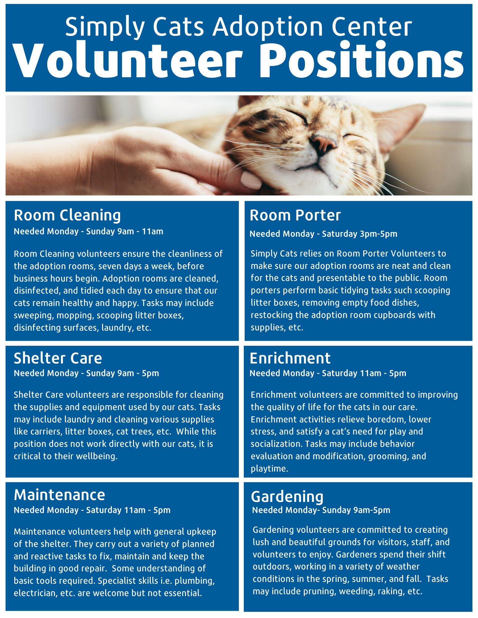 - I need volunteer hours for school. Can I volunteer at Simply Cats?